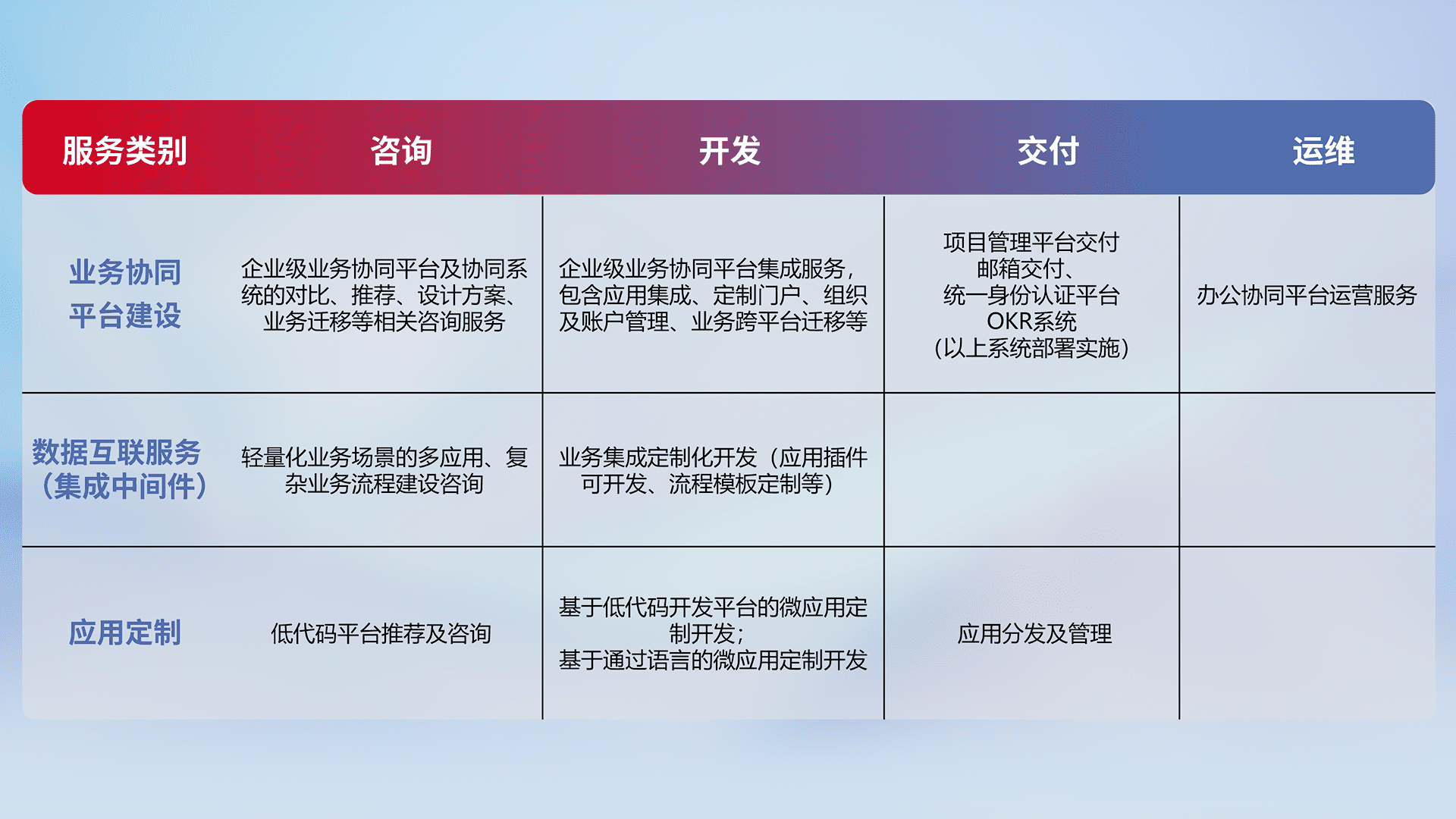 针对钉钉、、企微、、、、IDaas等平台级产品提供产品的规划、、方案、、、交付、、、定制化开发等服务,,,,实现如统一协同办公、、、、智能客户服务、、、混合会议管理、、、、智能数据查询、、、等业务场景,,,实现数字化转型。。。